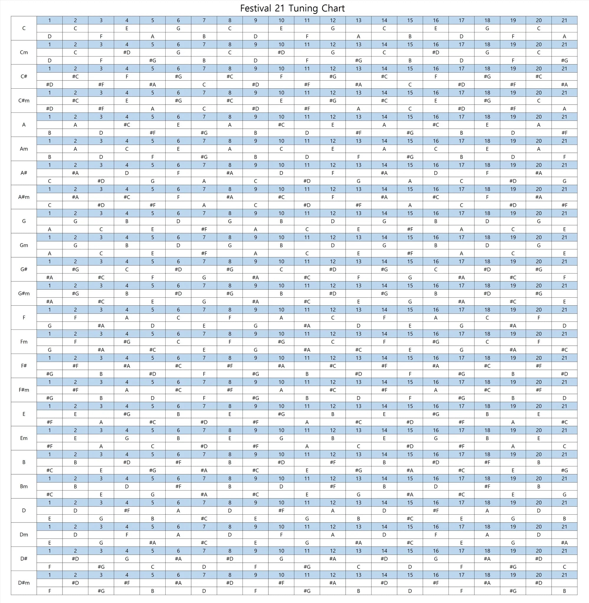 Minor (15keys) : Cm, C#m, Dm, D#m, Em, Fm, F#m, Gm, G#m, Am, A#m, Bm, ANm, LDm, LD#m