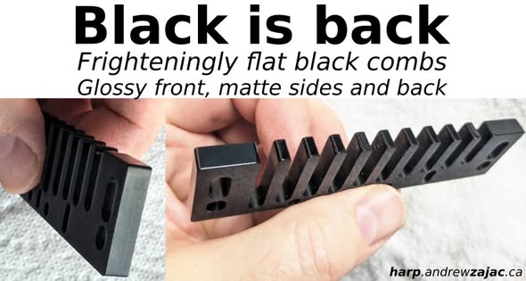 Black plastic (PMMA acrylic) combs that are individually flattened by hand - by me.