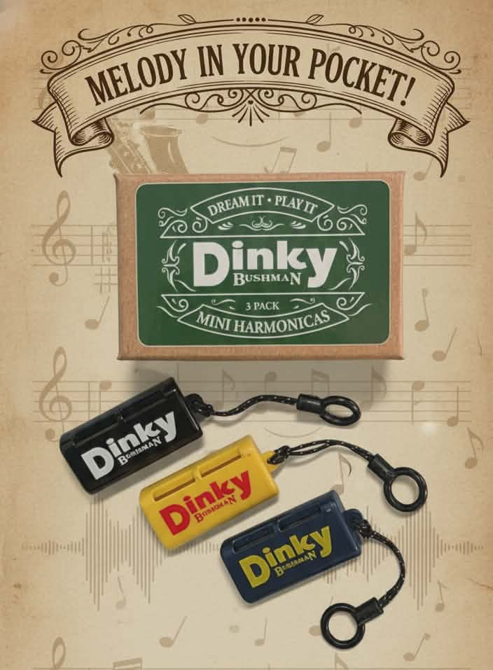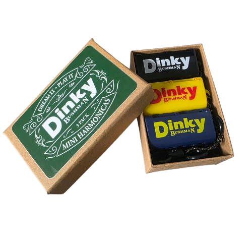With this 3 pack you get all 3 keys of our popular Bushman Dinky – the only true, 1-1/2″ mini harmonica upon which one can play the full 1st AND 2nd position scales! This 5 holer has the same note layout that your typical 10 holer has from holes 3 thru 7. Other 5 hole harmonicas on the market borrow the layout from holes 4 thru 8, but who needs the 8??? We all need the 3!!! The Dinky plays much better than the typical mini, it’s comfortable, and when you order this 3 pack you get the keys of G, A, and C! 3 colors – the color dictates the key – A – blue, C = black, and G – Yellow.