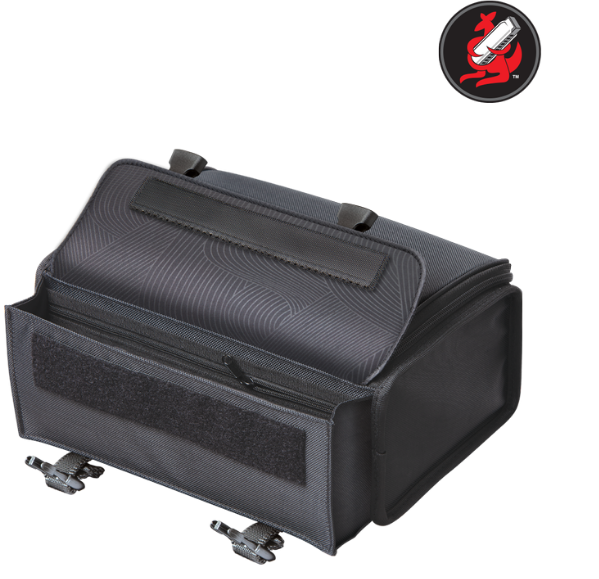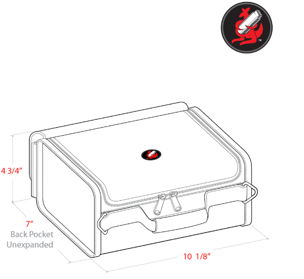 Padded back pocket with side release buckles and Velcro closure holds either mic cable, chromatic harmonica in or out of its case, Bulletini/personal microphone, with zippered inside pocket for personal items