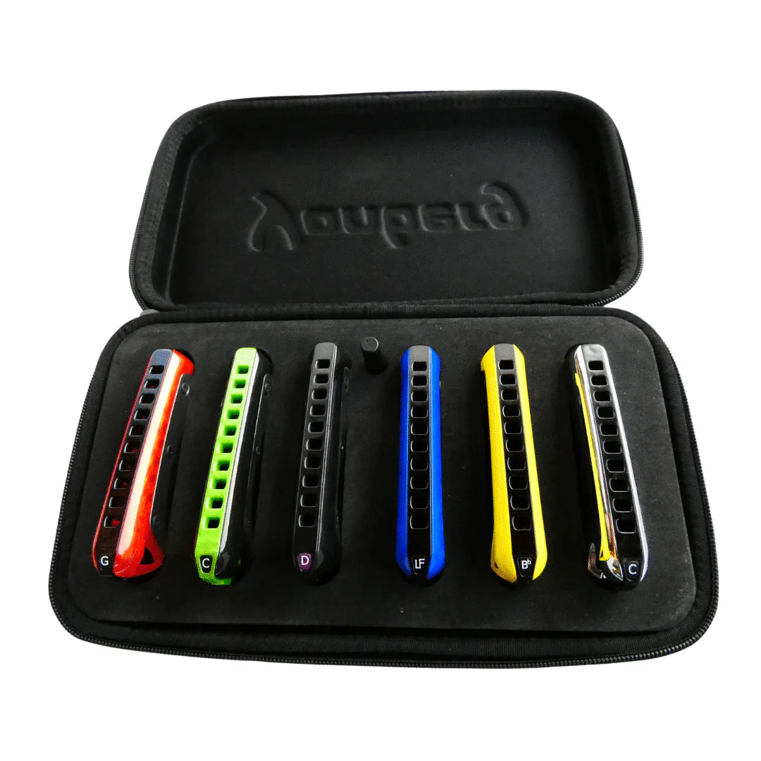 Black case for 6 Yonberg diatonic harmonicas.
