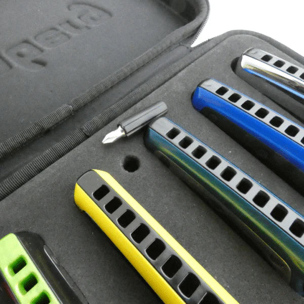 Its removable insert is made of foam and offers space for 6 diatonic harmonicas as well as for a mini screwdriver. Its zipped closure is practical and safe.